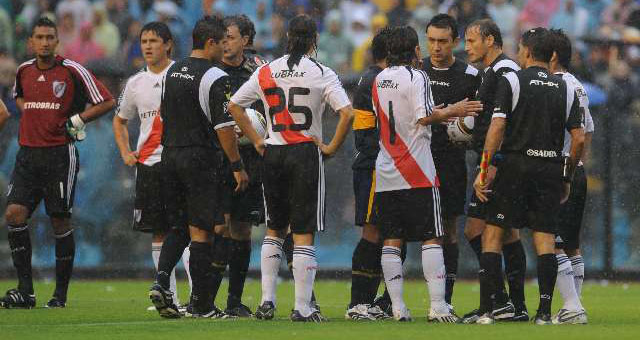 Héctor Baldassi decidió suspender el partido que jugaban esta tarde Boca y River en la Bombonera cuando iban 10 minutos del primer tiempo, a raíz del mal estado del campo de juego.